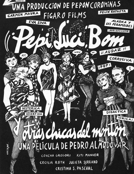 La práctica totalidad de los posters cinematográficos de Almodóvar han sido diseñados por artistas y creativos que empezaron sus carreras o tuvieron un protagonismo fundamental en los años 80 y el contexto de la movida madrileña. Además de Ceesepe, Ivan Zulueta [diseñador gráfico y director de cine] diseñó los carteles para Laberinto de pasiones, Entre tinieblas y ¿Qué he hecho yo para merecer esto?; Carlos Berlanga [miembro de Alaska y los Pegamoides y Dinarama] diseñó el cartel de Matador; Juan Gatti [diseñador y fotógrafo] realizó los posters de Mujeres al borde de un ataque de nervios, Atame, Tacones lejanos, Kika, La flor de mi secreto, Carne Trémula y Hable con ella; y Oscar Mariné [diseñador gráfico y fundador de la mítica revista Madrid me mata] diseñó el poster de Todo sobre mi madre. Así, incluso en aquellas películas que ya se aleja de la estética de la movida, en los años 90 y con sus películas más recientes, Almodóvar mantiene un vínculo creativo con artistas que iniciaron su propia obra paralelamente a la suya, en los años 80. El caso de Ivan Zulueta es acaso distinto, pués éste pertenece a una generación anterior y ya era un afamado autor, tanto en diseño como en el cine, en los ambientes alternativos de los 60 y 70. Pero ceesepe, toda la cohorte de personajes inauditos y discordantes que fue colocando en sus ilustraciones. Aunque ya hemos hablado de él en alguna otra ocasion, llegaremos de nuevo a su figura con la mirada puesta en sus dibujos publicados en la prensa alternativa de Barcelona, y lo veremos avanzar hacia la pintura en los primeros años 80. Uno de los grandes nombres de la movida madrileña.