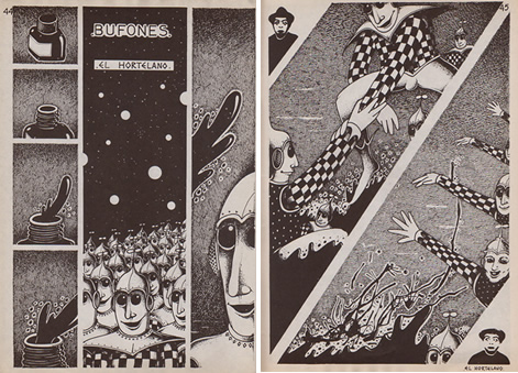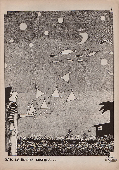 La obra gráfica que José Alfonso Morera "El Hortelano" empieza a publicar en las páginas de la revista Star sorprende por dos razones. Si por un lado, no se puede hablar de sus cómics de los 70 en función de la tradición estético-contracultural que la propia revista había potenciado a través de dibujantes como Nazario, Francis Masse, Gallardo o Mariscal [y autores norteamericanos como Shelton y Crumb], por otro, las correlaciones estilísticas entre ese periodo y la pintura que desarrollaría a partir de los primeros años 80 se muestran confusas. Se trata de un cómic alegórico que se desmarca de las corrientes del tebeo underground de la época tanto por su estilo como por la forma de abordar el relato, con una clara evocación de la ciencia ficción, por decirlo así, trascendental, pero también de los frescos oníricos de El Bosco, aspecto este último que tratará de manera aún más explícita en la obra Las cuatro estaciones [1978], formada por cuatro cuadros que escenifican un vagón de metro poblado por autómatas y que simbolizan las estaciones del año. Aunque sigue publicando en Star, con portadas memorables y obras que continúan esa trayectoria bosquiana en dibujos como Babel Surpeuplée [1978], la obra de El hortelano inicia un proceso de alejamiento respecto al trazo de sus primeros trabajos, orientándose hacia la pintura.