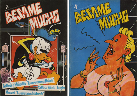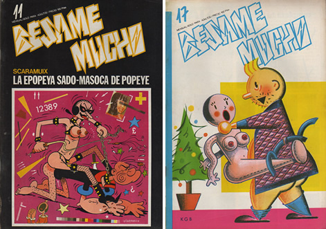 Lo que sigue son cuatro portadas de Bésame Mucho en las que (estamos en los primeros trazos de los años 80) se procede a una capitalización de algunos personajes emblemáticos del cómic internacional por medio de aquellos temas que habían sido recurrentes en el underground de mediados de los 70, el sexo y la droga, una subversión del aparato iconográfico infantil trasladado a la lectura irrevente de aquello que se llamó cómic para adultos. Quién podría imaginarse a Tintín follándose a una muñeca hinchable, a Olivia y Popeye dejándose arrastrar por sus más oscuros deseo sadomasoquistas... Bien pudiera ser que el Pato Donald hubiera encontrado su verdadero lema vital entre las filas marginales y gregarias de Makoki, pero lo que se trasluce es el estado de rebeldía contra el aparato de consumo masificado. Si la Castafiori decide enseñar las tetas, por qué no decir también que la sociedad española, a expensas de una corriente subterránea, iba a dar todavía con los signos de otros cambios más profundos. Esa misma sensación ya se había vivido en las Ramblas barcelonesas cuando Ocaña y Nazario, personajes fundamentales para entender las filias y fobias del periodo de la Trasición Democrática, salen de paseo, travestidos, para devolver a la luz de la calle lo que había permanecido oculto durante 40 años. Esas portadas de Bésame Mucho, arriesgadas en el mismo grado que otras tantas que habían supuesto el cierre temporal para la revista Star, también suponen la práctica de una provocación. Y si se quiere, de pervertir los términos de la cultura de masas.